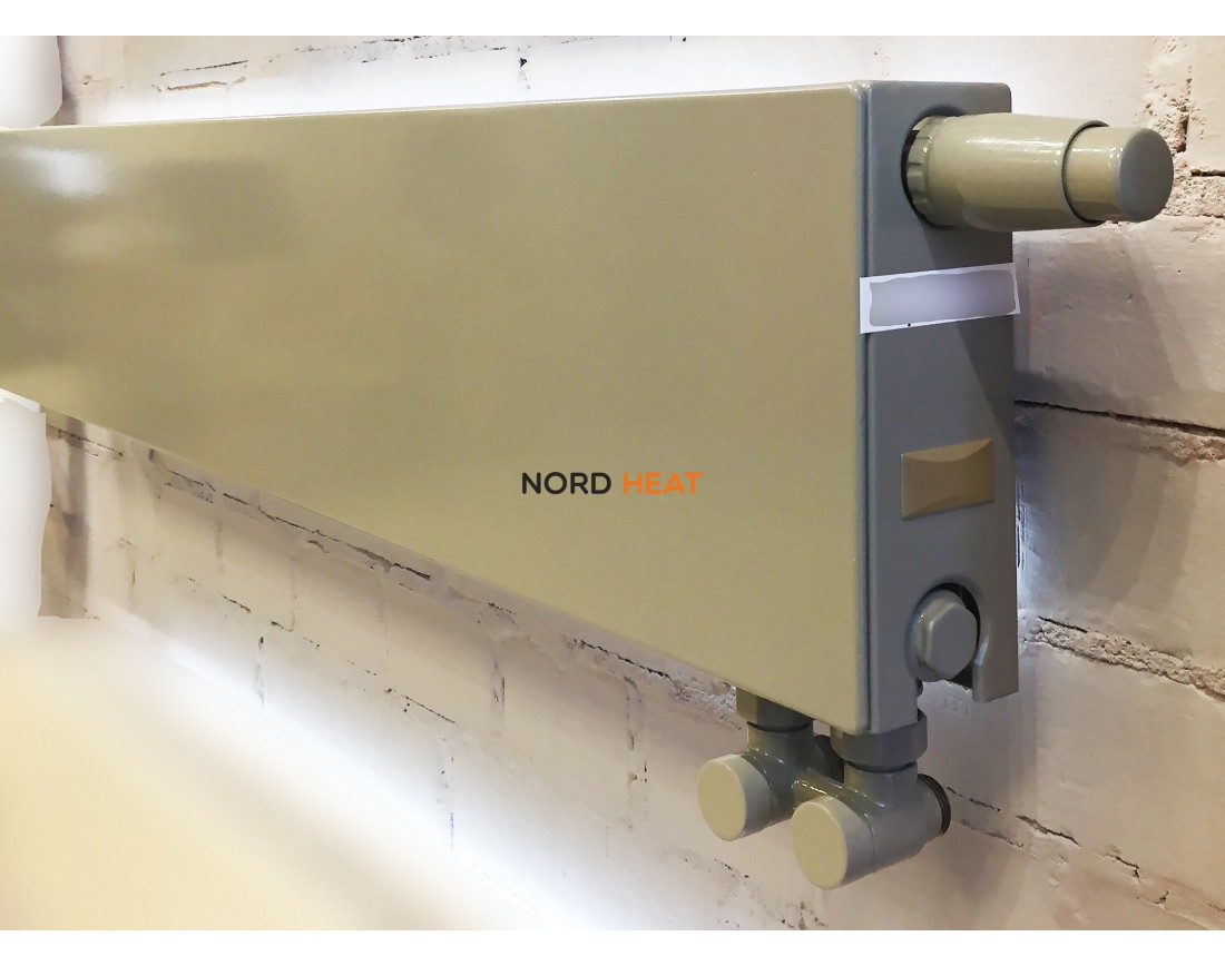 Представляет собой невысокий дизайн-радиатор с плоской передней панелью и аккуратно скругленными краями.