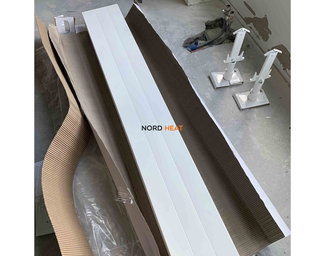 Представляет собой горизонтальный дизайн-радиатор с плоской передней панелью с продольными бороздками и аккуратно скругленными краями. Для установки на стены под окна с низкими подоконниками, а так же для установки на пол под панорамные окна (витражи), с возможным подсоединением снизу из пола.
