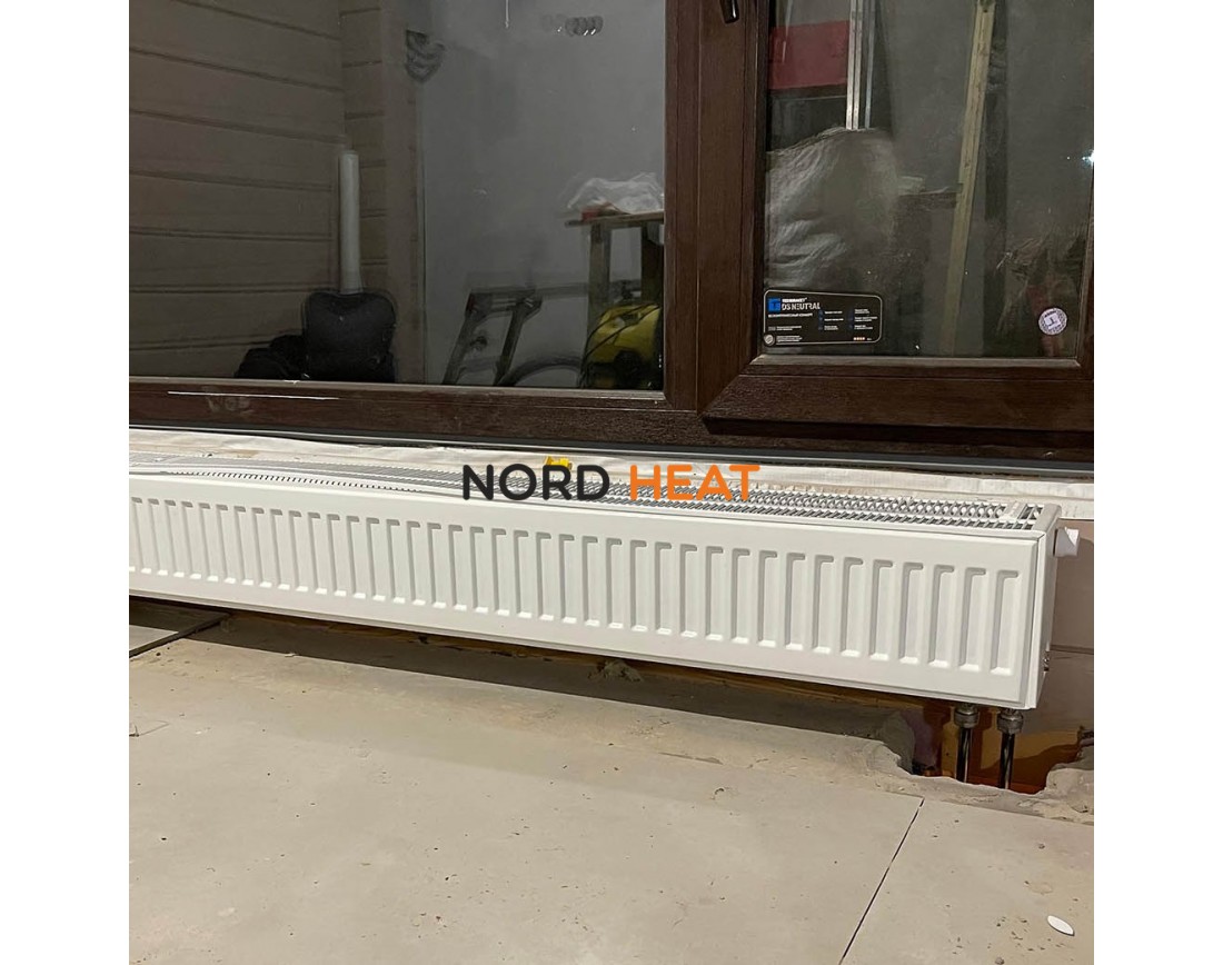 Представляет собой горизонтальный дизайн-радиатор, для установки на стены под окна с низкими подоконниками, а так же для установки на пол под панорамные окна (витражи), с возможным подсоединением снизу из пола.